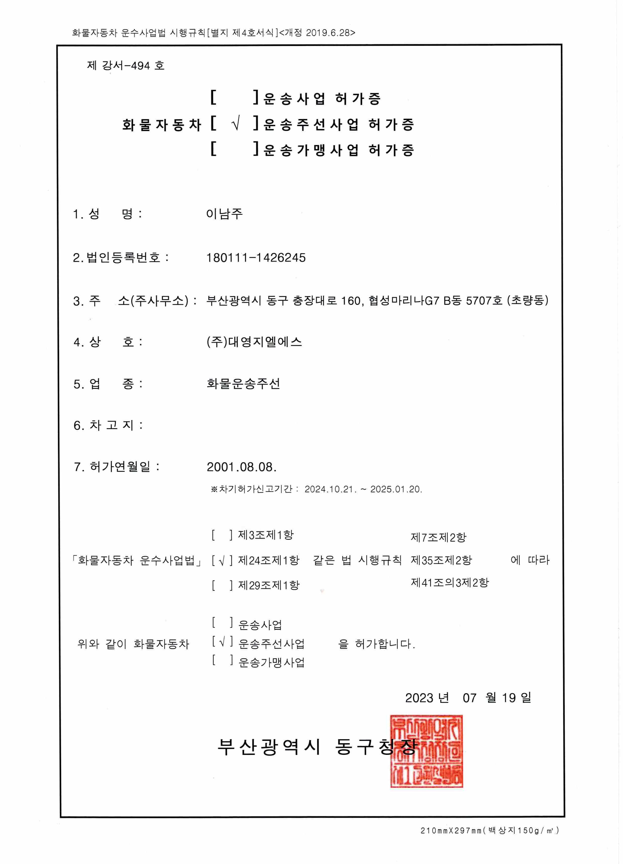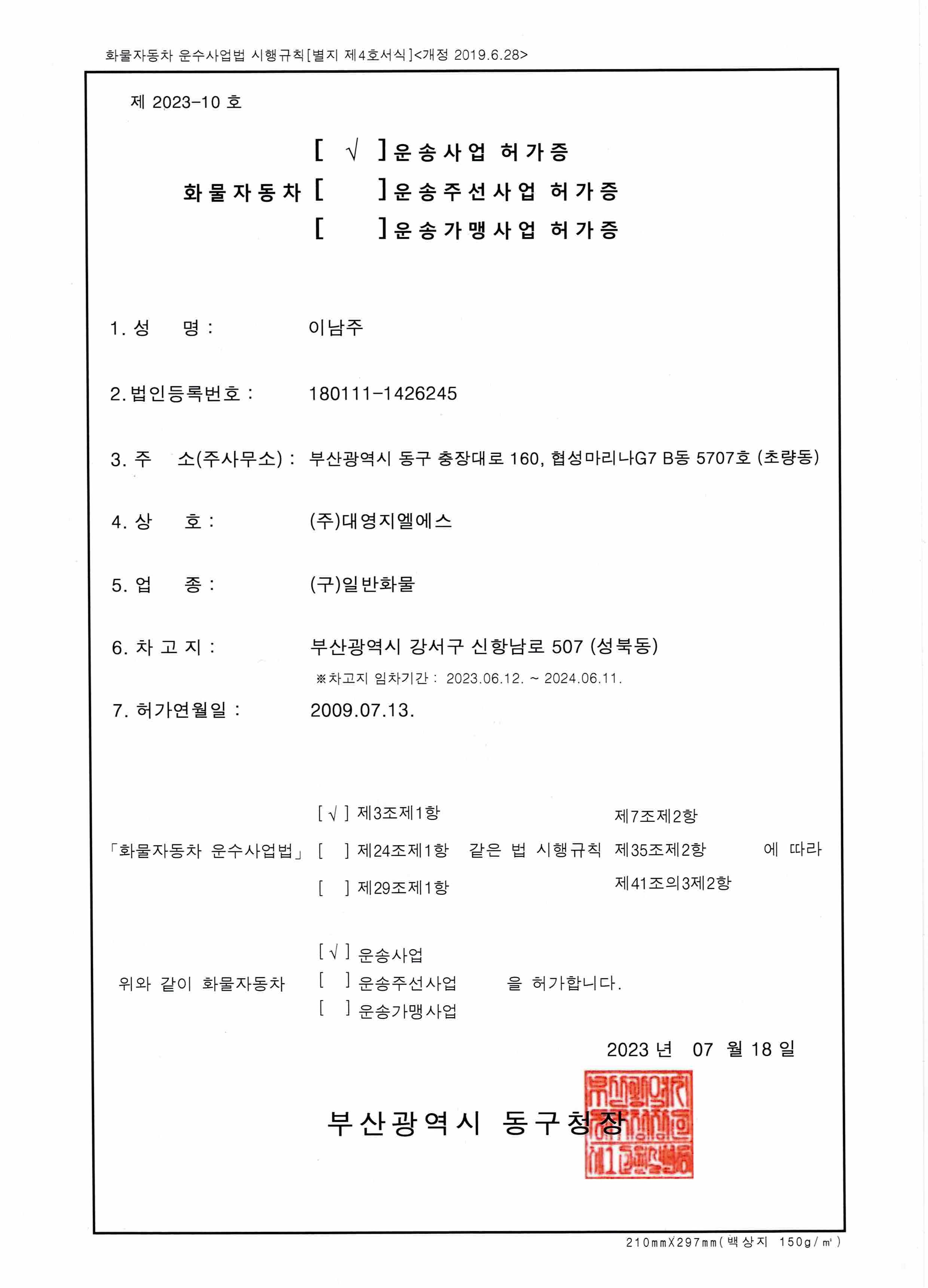 - 화물자동차운송사업허가증