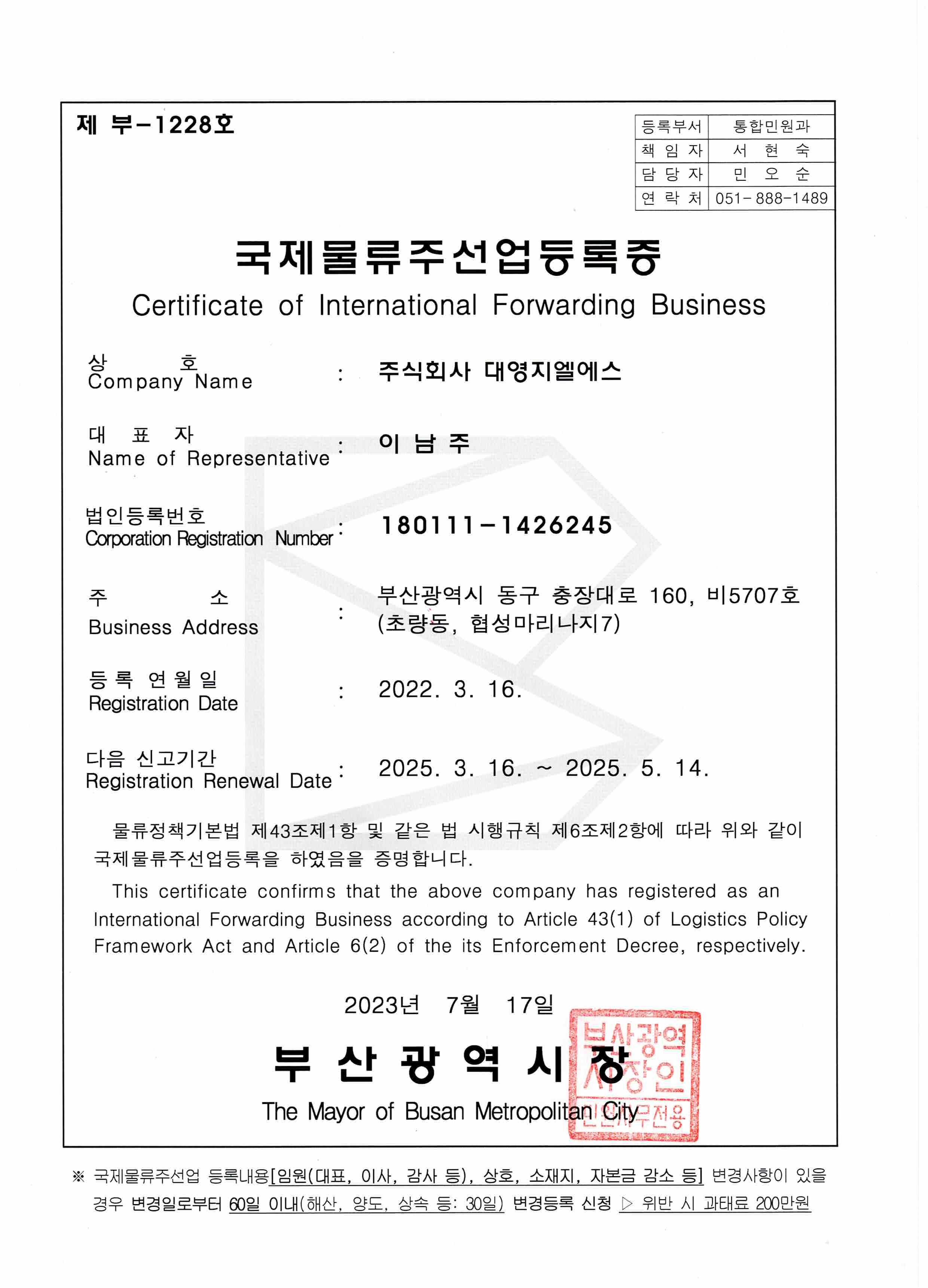 - 국제물류주선업등록증
