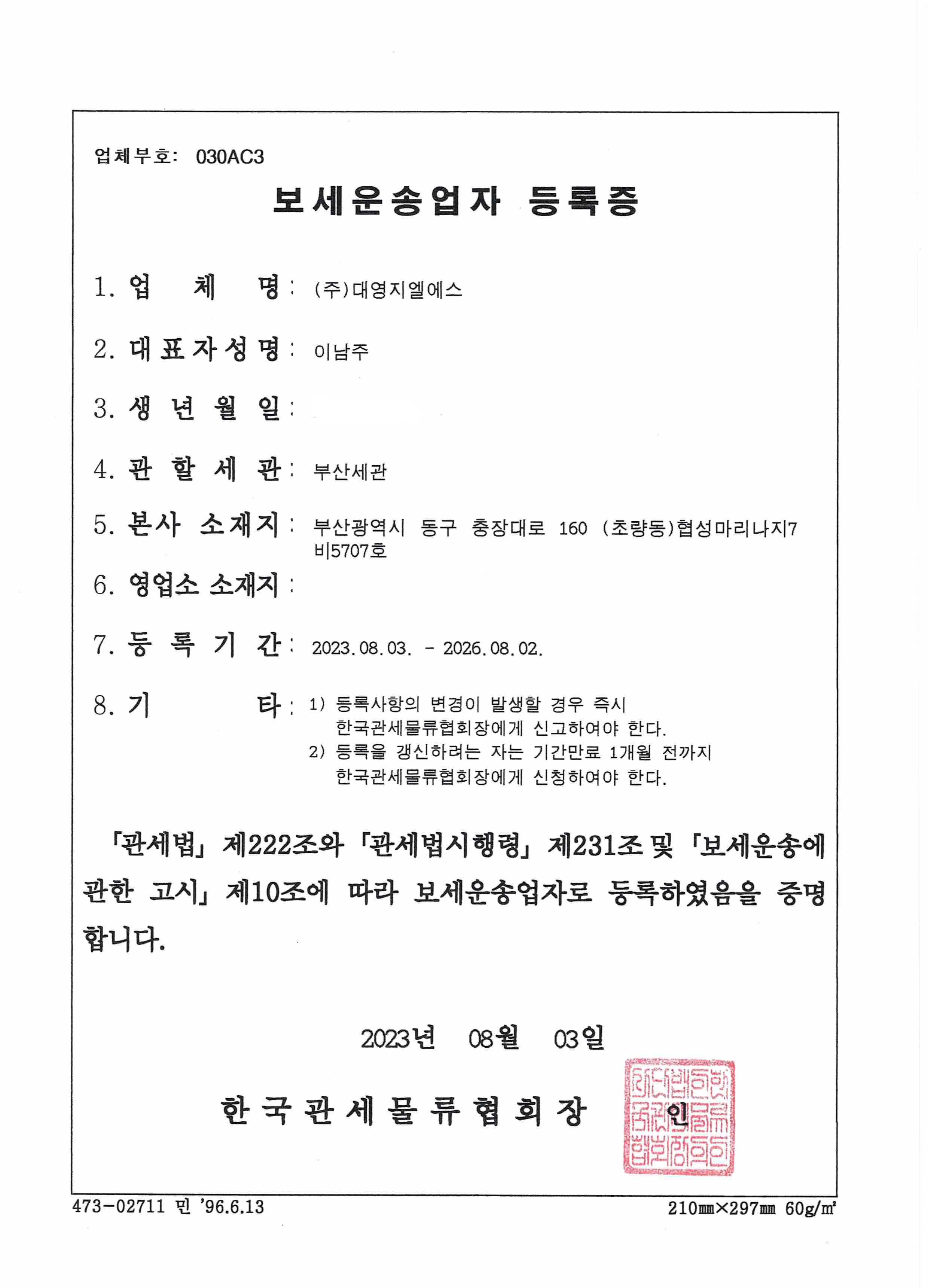 보세운송업자 등록증
